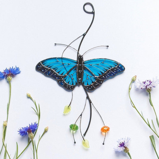 Blue Butterfly Stained Glass - Hangings Decor 8.5x4.5 inch