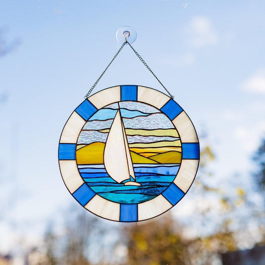 Sailboat Yacht Round Stained glass - Window Hanging 11x11 inch