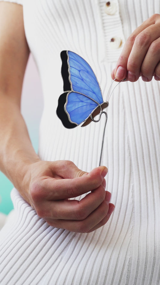Blue Butterfly Stained Glass - Suncatcher Planter Decor 3.3x2.3 inch