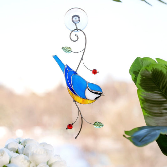 Blue Tit Window Hanging – Stained Glass Bird Decor A Delightful Symbol of Joy, Curiosity