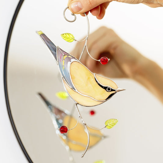 Stained Glass Cedar Waxwing Bird - Suncatcher Window Decor 7.5x3.9 inch