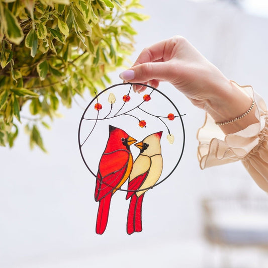 Pareja de cardenales rojos de vidrieras - Decoración colgante de ventana