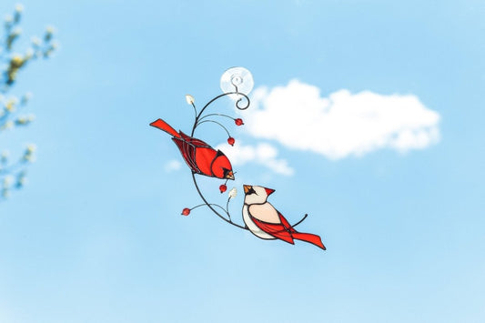 Vitrail Paire de Cardinals Rouges suncatcher fenêtre suspendue Vitrail Art Modern Decor Cadeau de la fête des Mères