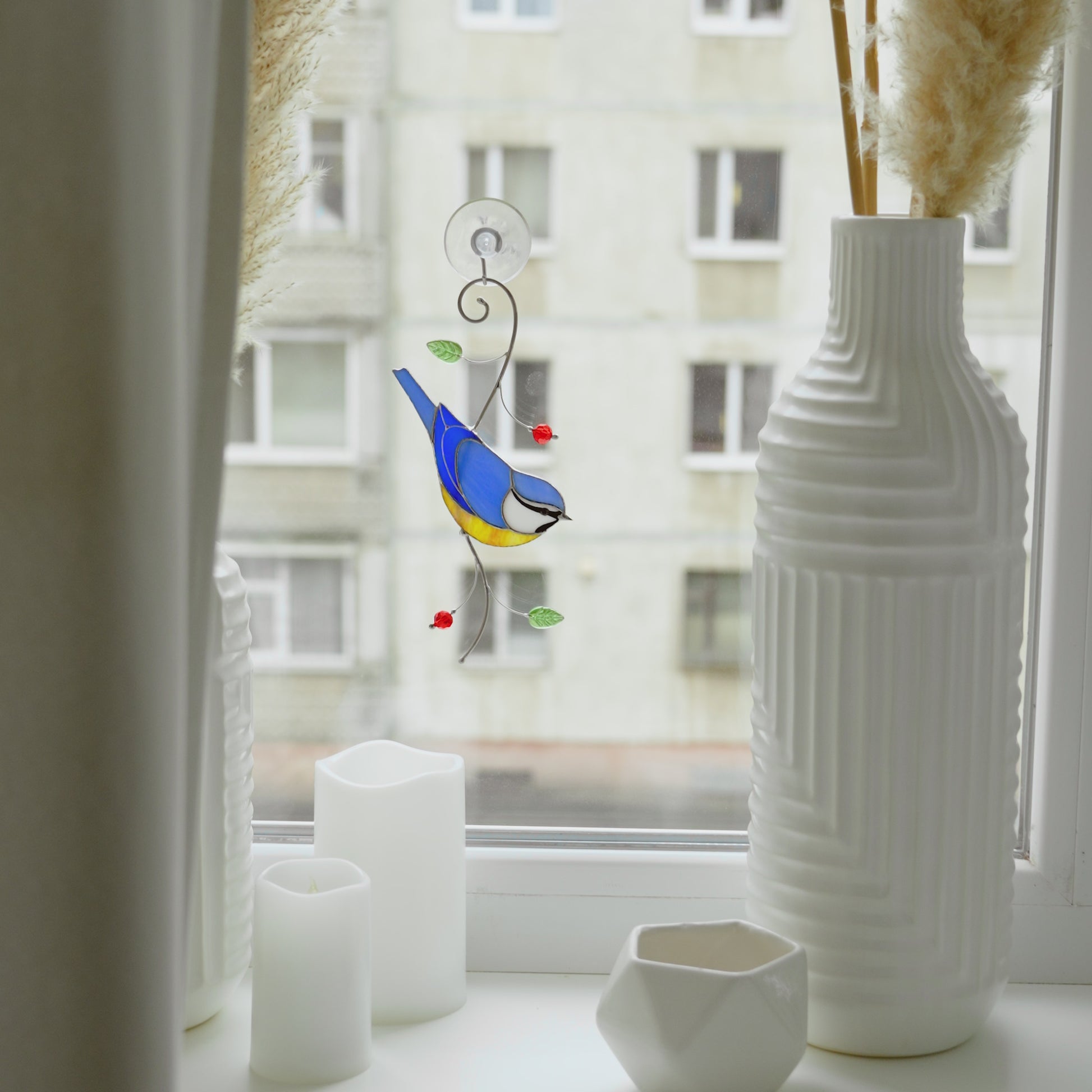 Blue Tit Window Hanging – Stained Glass Bird Decor A Delightful Symbol of Joy, Curiosity