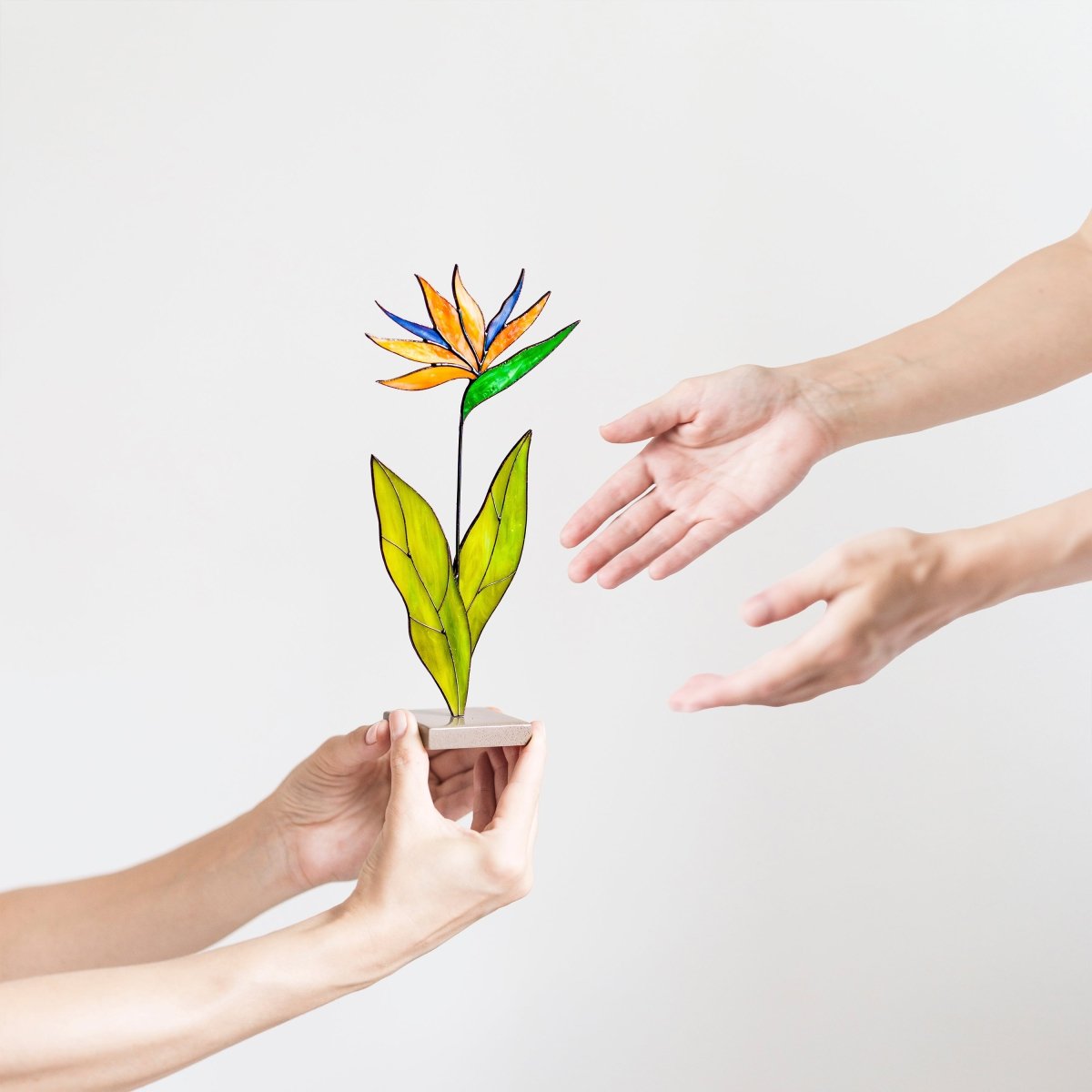 This striking stained glass Bird of Paradise flower, or Strelitzia, captures the exotic beauty of the tropics. Handcrafted with a sculptural form, this piece features vibrant orange and blue petals and two large green leaves on a sturdy stone base. It’s the perfect gift for those who love unusual flowers and dramatic, eye-catching decor.