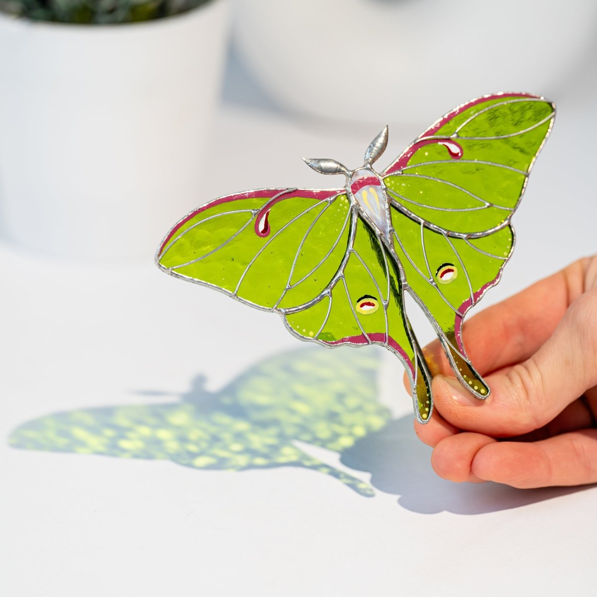 Meet our best-selling butterfly – the elegant Luna Moth made from real stained glass.