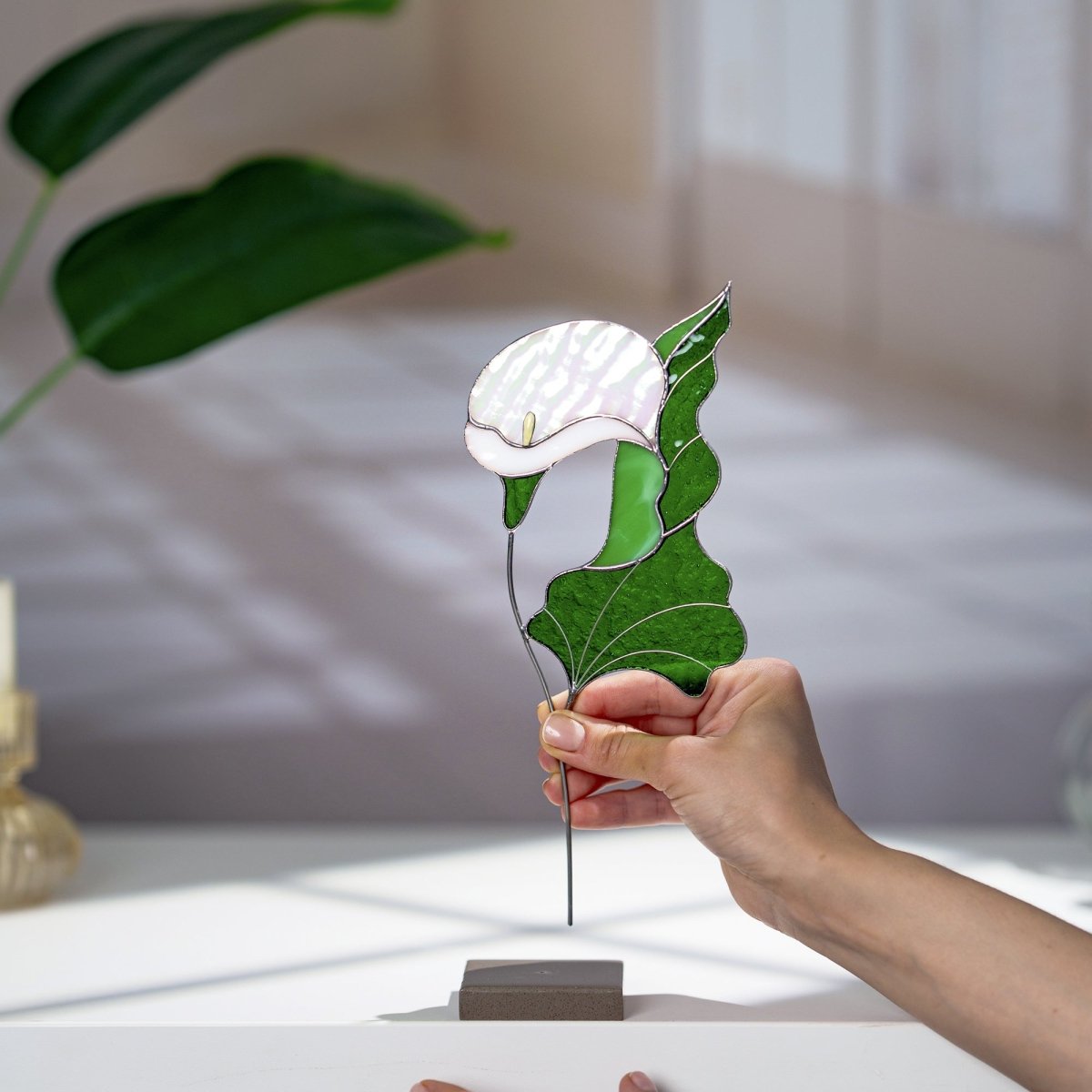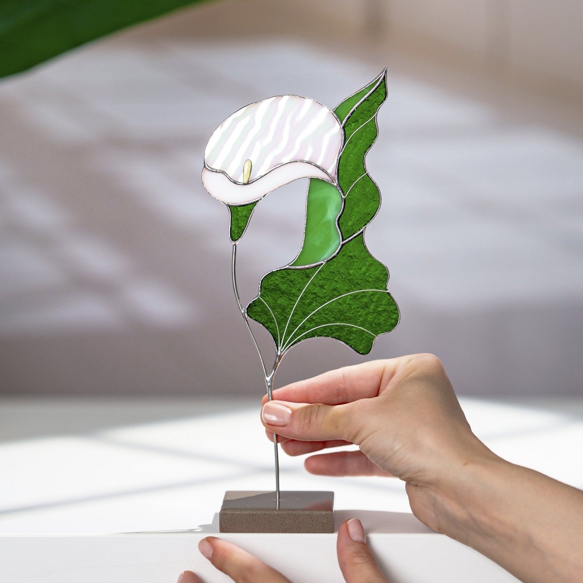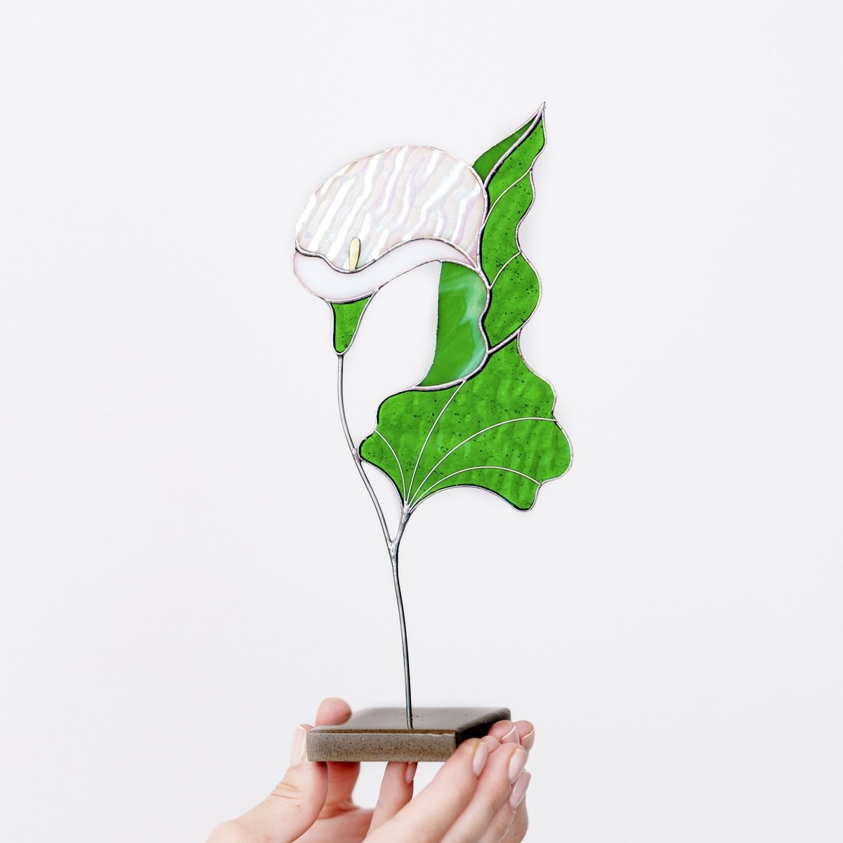 dd a touch of timeless beauty to your home with this handcrafted stained glass Calla Lily. Designed to rest gracefully on a stone base, this elegant flower sculpture captures the pure and sculptural form of the calla lily in vibrant stained glass. Its refined shape and rich colors bring a warm, sophisticated accent to any tabletop, shelf, or windowsill.