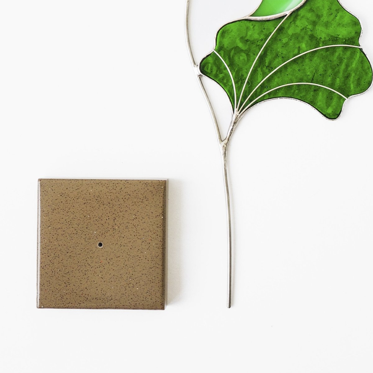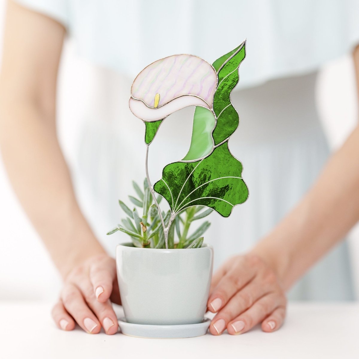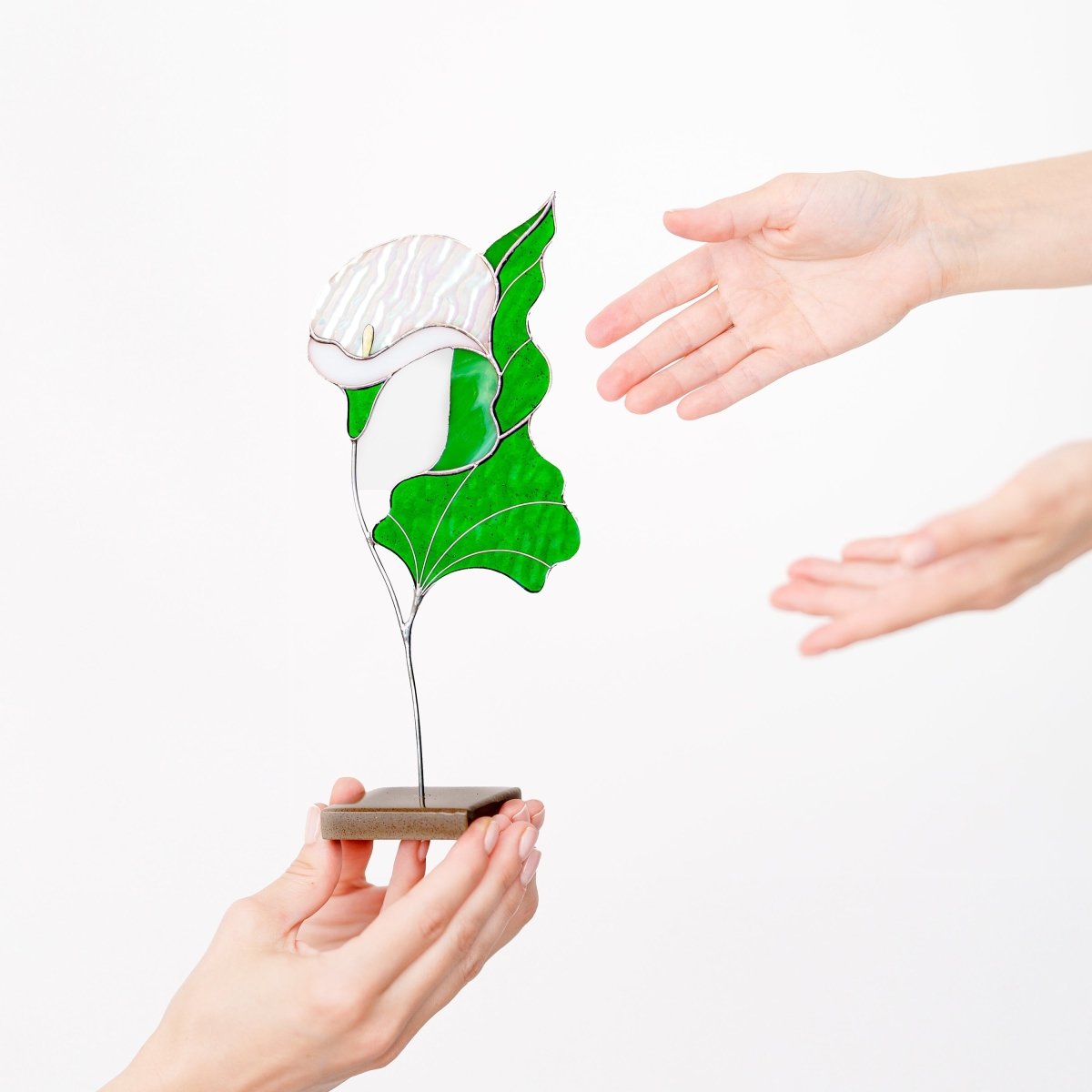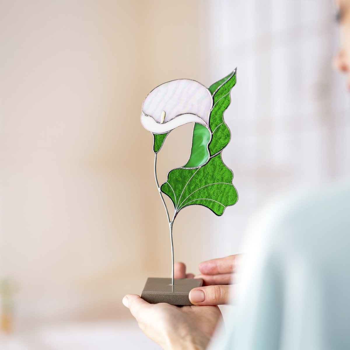 dd a touch of timeless beauty to your home with this handcrafted stained glass Calla Lily. Designed to rest gracefully on a stone base, this elegant flower sculpture captures the pure and sculptural form of the calla lily in vibrant stained glass. Its refined shape and rich colors bring a warm, sophisticated accent to any tabletop, shelf, or windowsill.