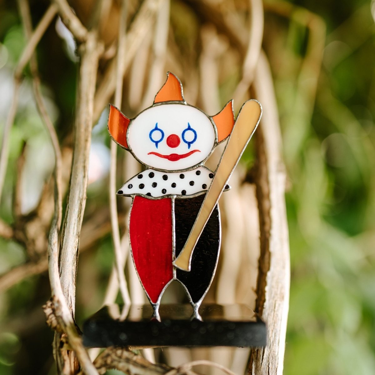 Looking for magical decorations to your Halloween? This handmade stained glass Circus Clown with a Baseball Bat is the perfect choice for your Halloween decorations.