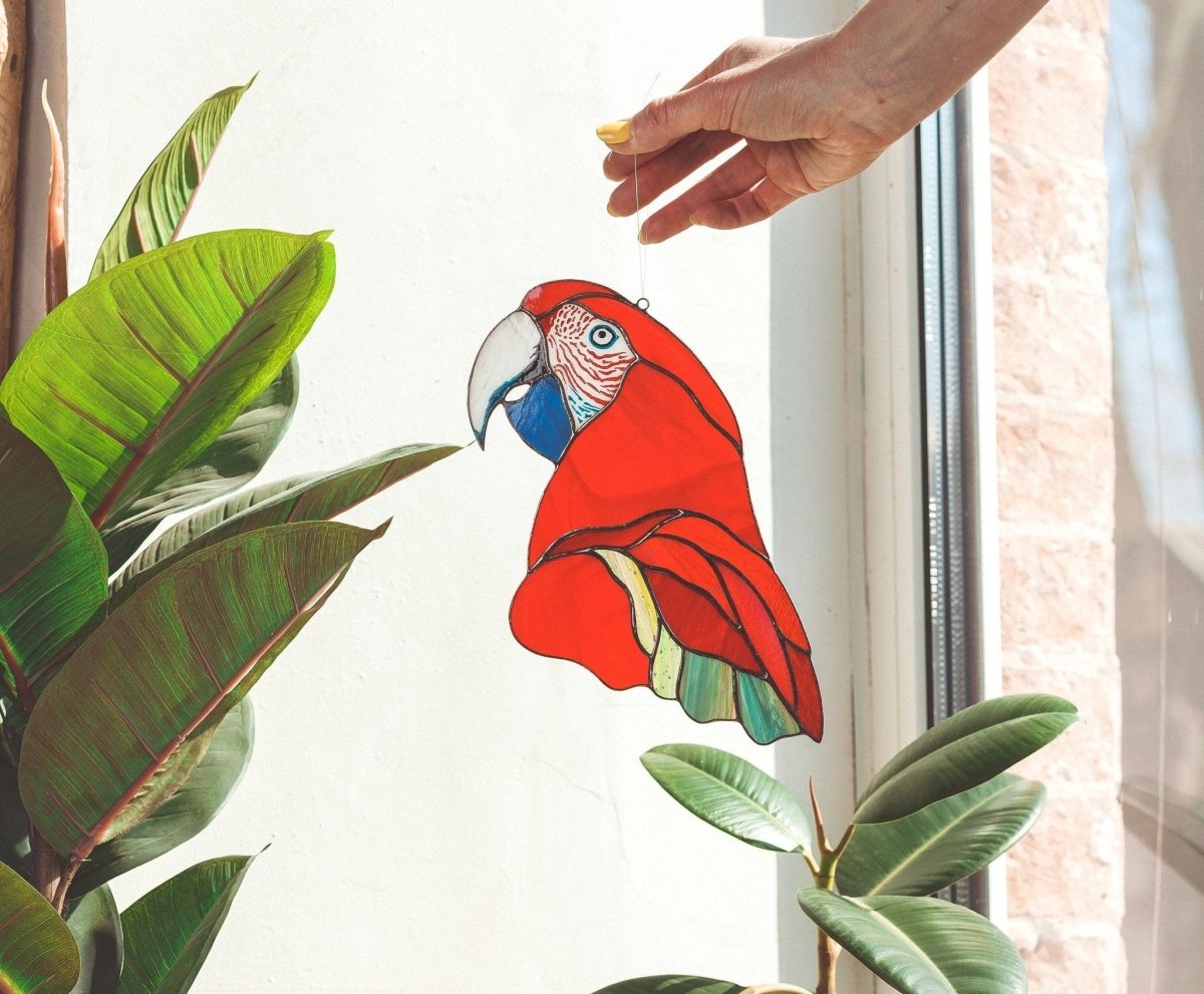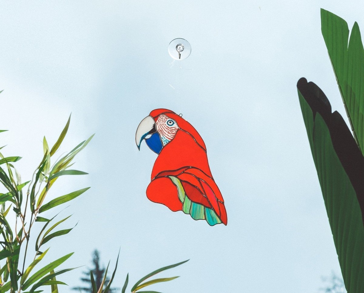 We've made this incredible collection of stained glass sun catchers especially for parrot lovers. Macaw parrots have the strongest beak in the world. The Parrot Jaco, who knew 400 words, got into the Guinness Book of Records. The most ancient remains of the feathered cockatoo parrot date back to between the early and middle Miocene, that is, 24-16 million years ago.