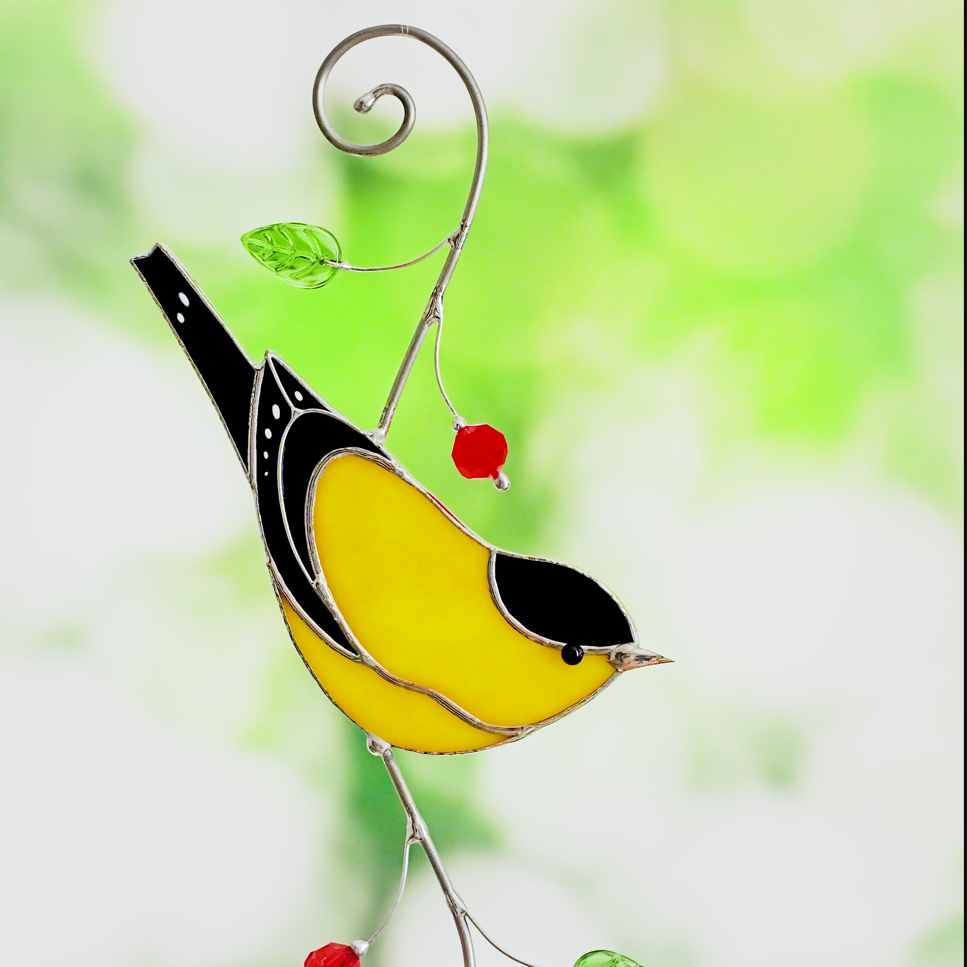 This bright yellow goldfinch brings joy, warmth, and a splash of sunshine to any window. Handcrafted from stained glass, it reflects natural light beautifully and adds a lively accent to your home decor — perfect for bird enthusiasts or seasonal gifts.
