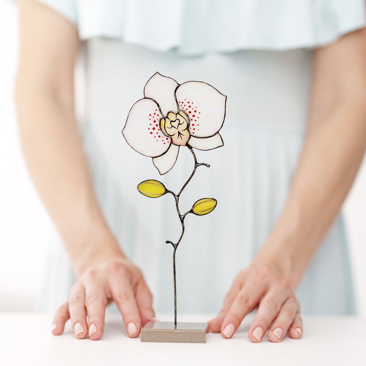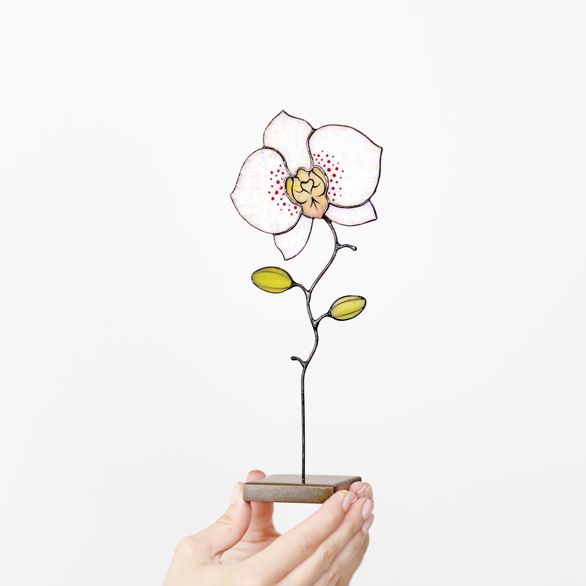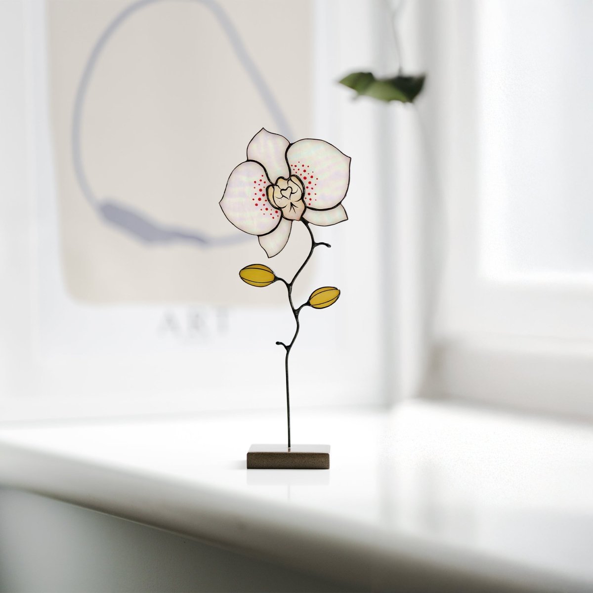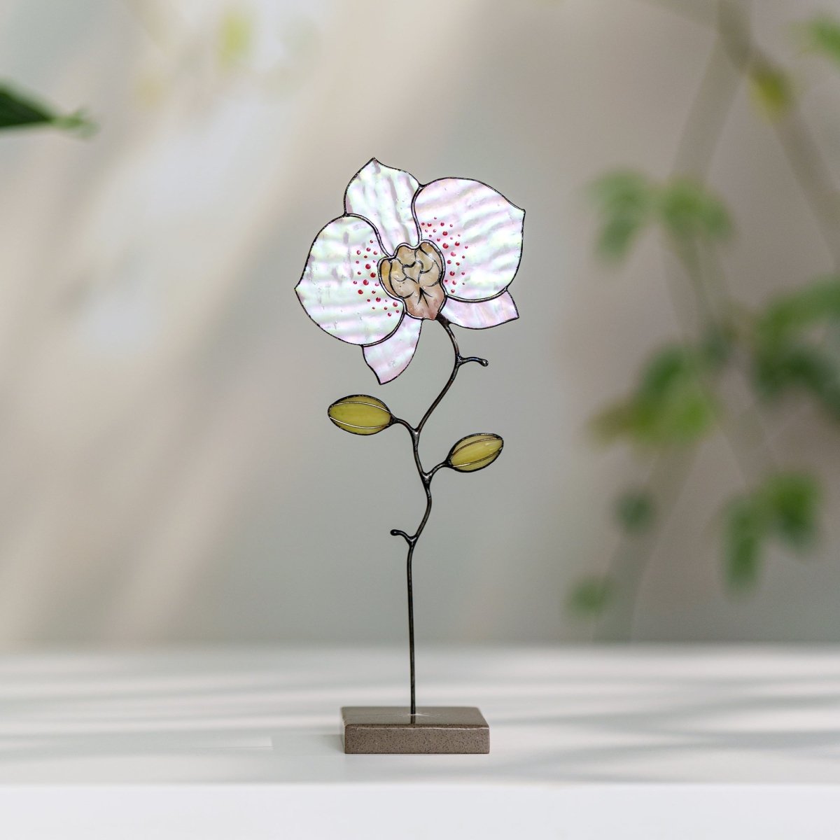 Celebrate elegance and nature with this radiant stained glass orchid, delicately crafted to bring artistic beauty to your space. The graceful stem and intricately detailed petals capture the quiet strength and allure of a blooming orchid. Whether placed on a windowsill, shelf, or desk, this tabletop sculpture adds a refined touch of floral charm to any setting.