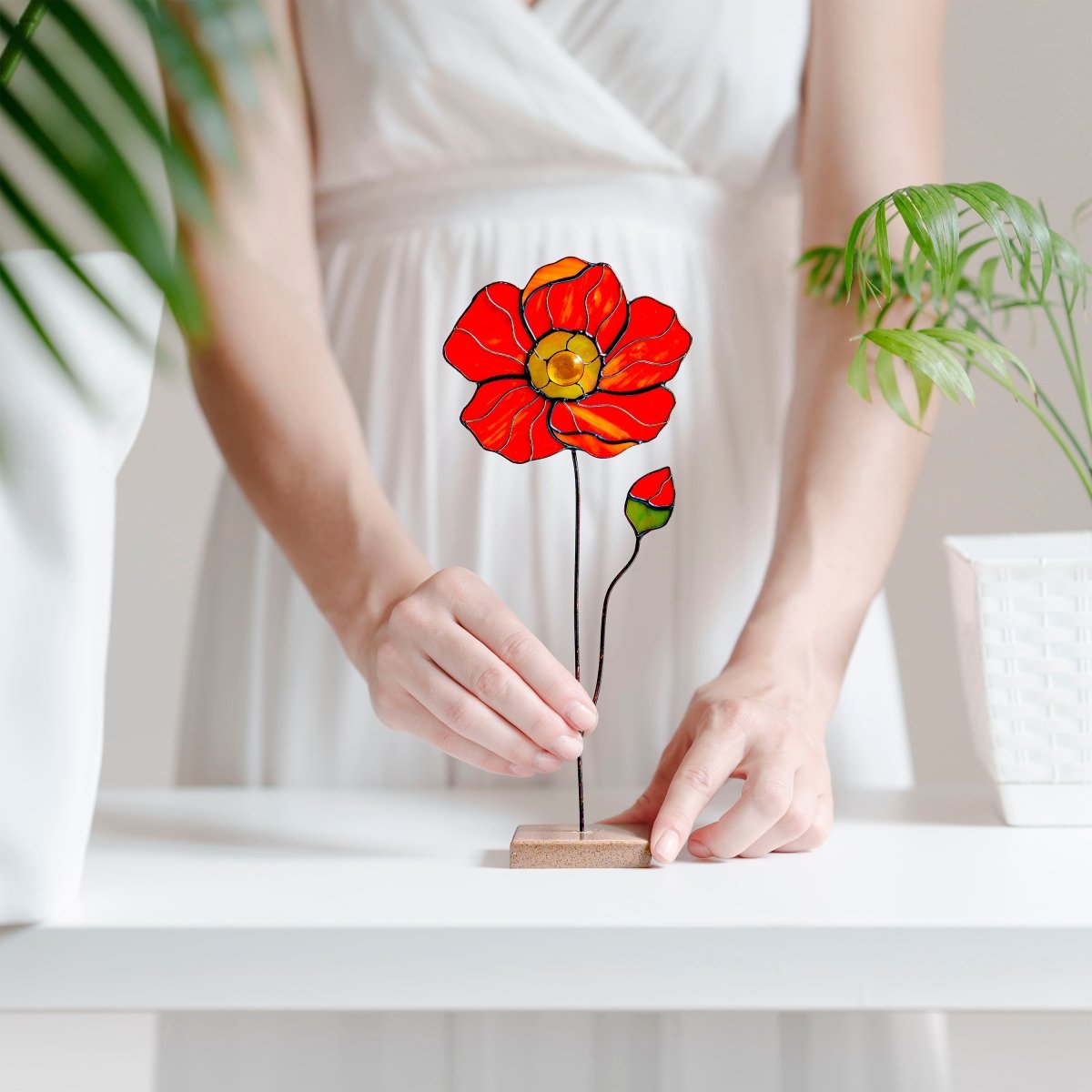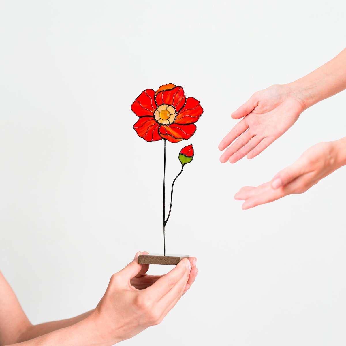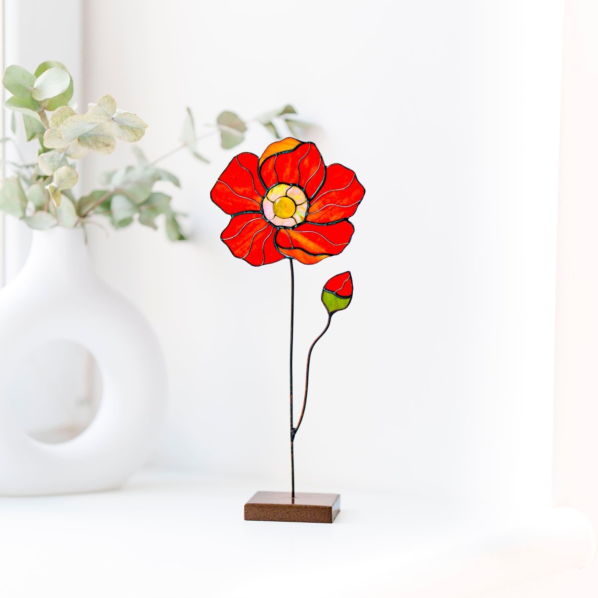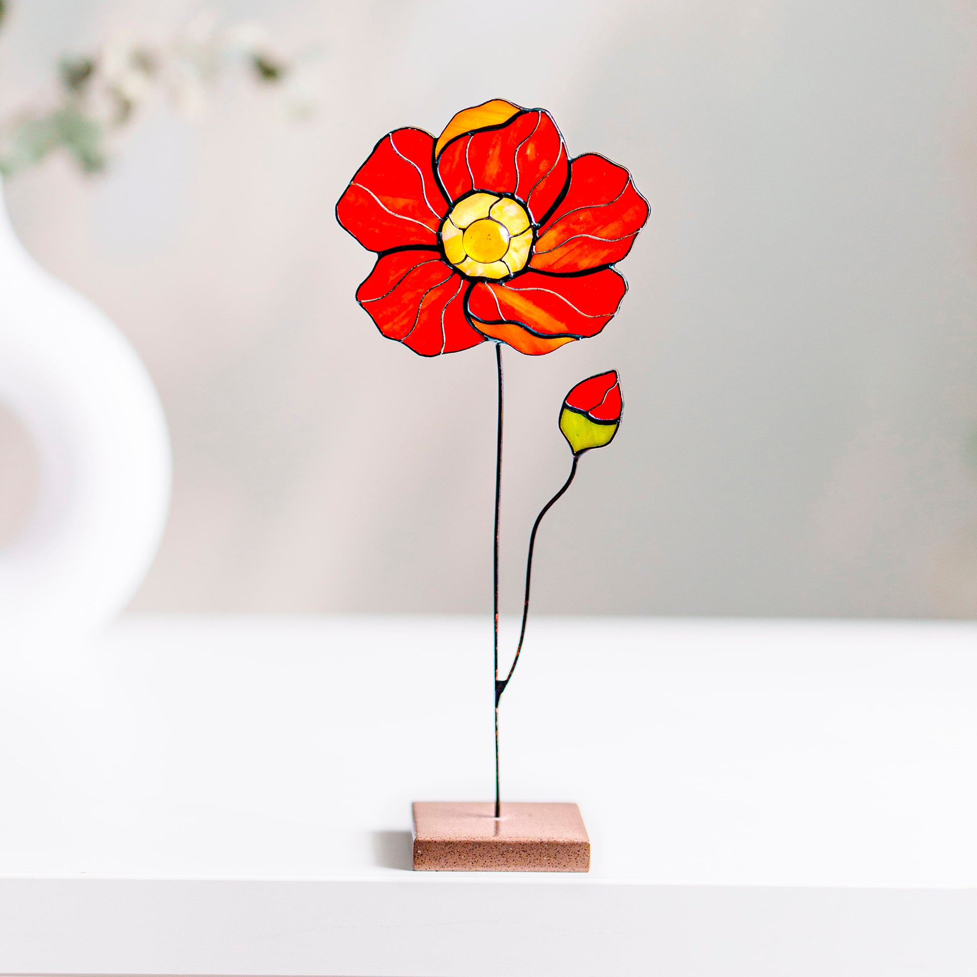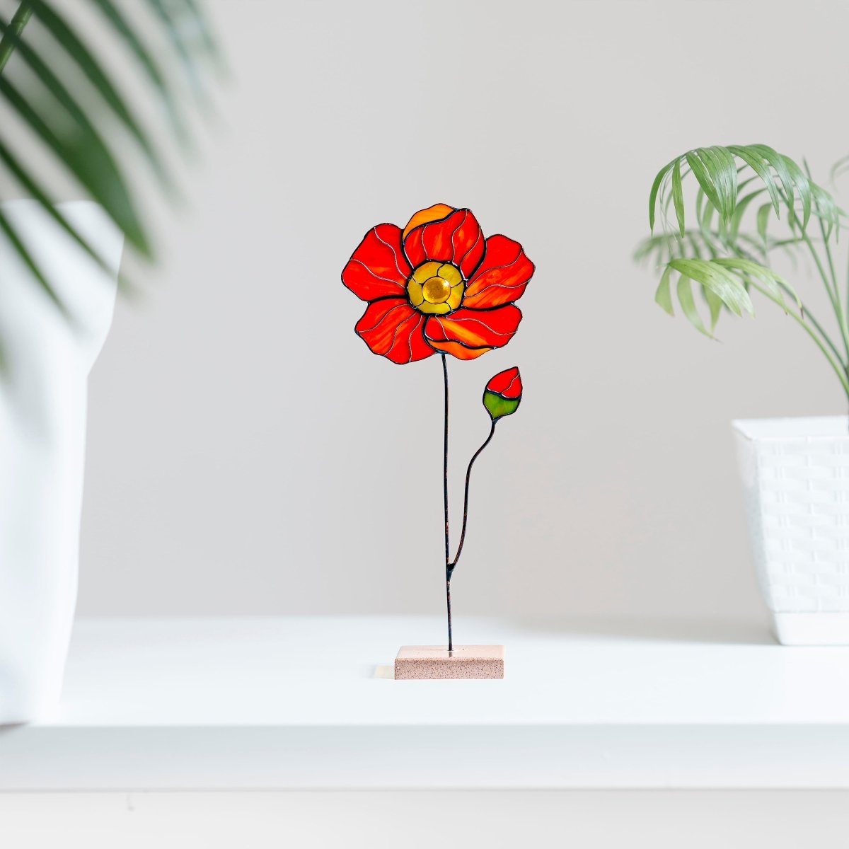 This vibrant stained glass poppy brings a splash of color and artistry into any room. Handcrafted with care, this piece features a brilliant red and yellow poppy flower alongside a delicate green bud, all on a sturdy wooden base. It's a perfect gift for flower lovers and anyone who appreciates unique, handmade home decor.
