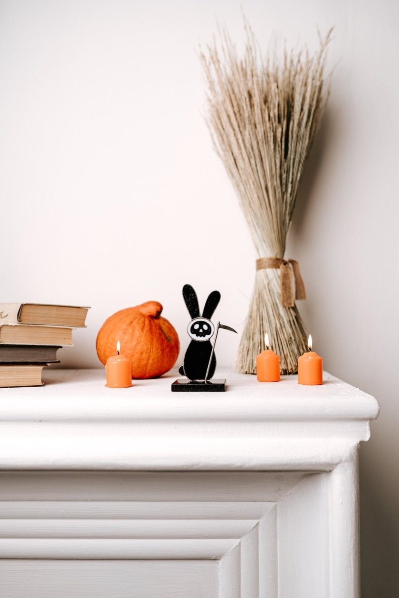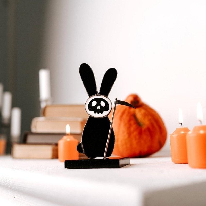 As the night falls and the darkness sets in, this bunny sheds its innocent demeanor and dons a black coat, wielding a scythe with deadly precision. The intricate details of the stained glass design capture the transformation from cute and cuddly to dark and menacing, making it a truly spooky addition to your Halloween decor.