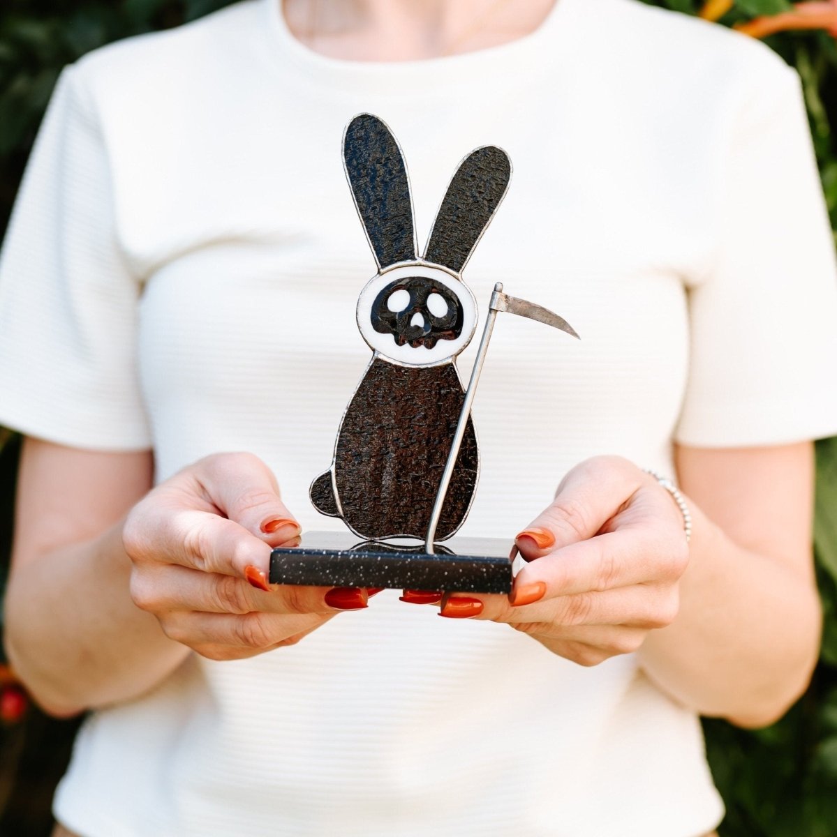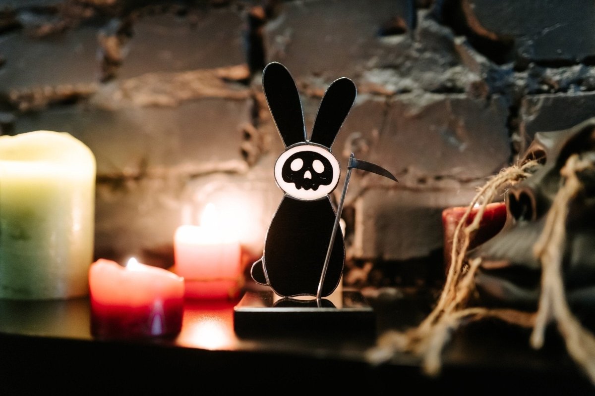 Looking for a Spooky and Gothic piece to add to your home decor? Our Stained Glass Suncatcher Bunny With Scythe on a stone stand is the best choice!