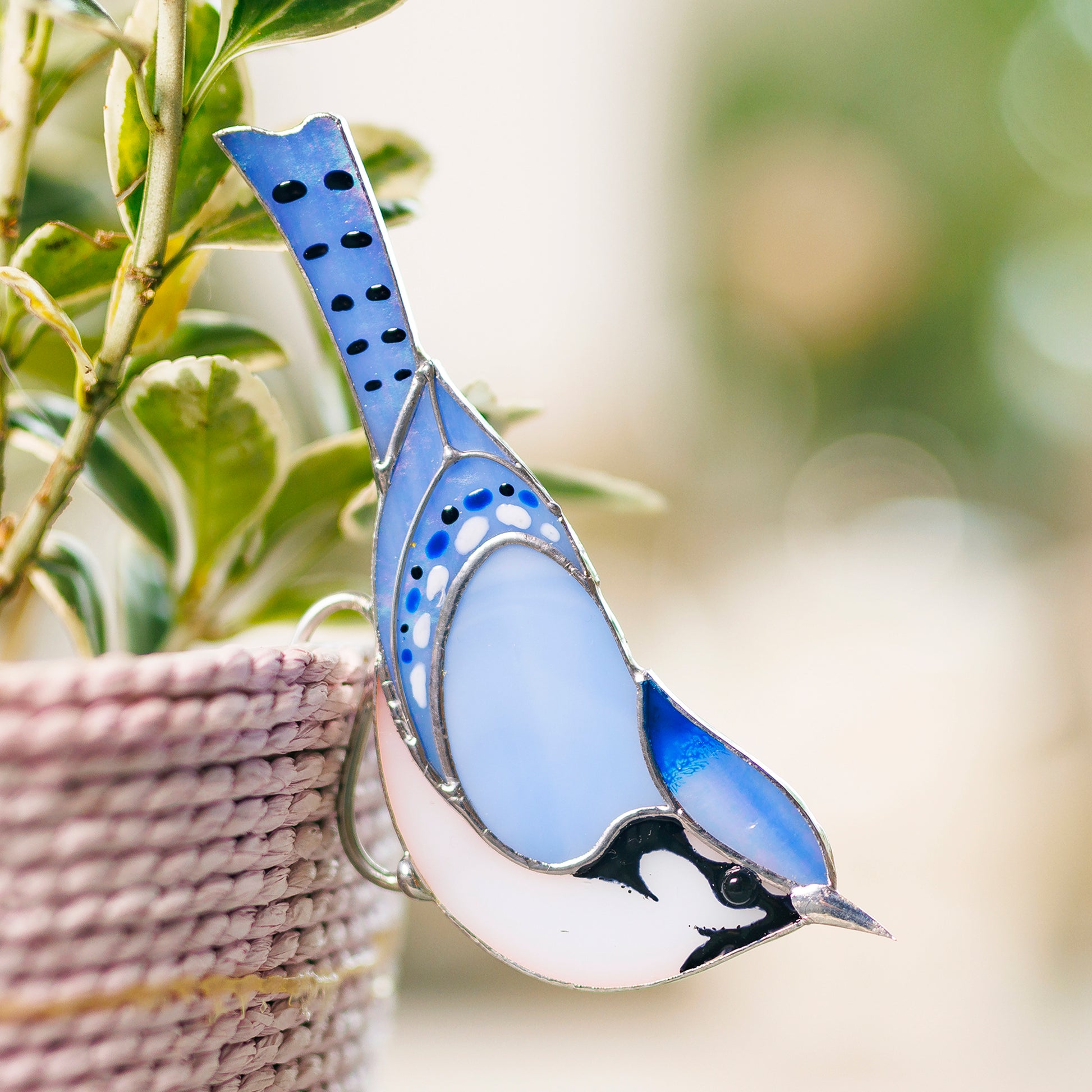 Elevate your space with our exquisite stained glass blue jay, gracefully adorning any planter. Recalling nature's tranquility, this delightful creation brings a breath of fresh air to any home or office, evoking the spirit of spring. Whether as a thoughtful "thinking of you" gift or a personalized gesture, this adorable suncatcher sparks joy and warmth. Explore a new way to incorporate stained glass decor into your surroundings and let nature's beauty bloom indoors.