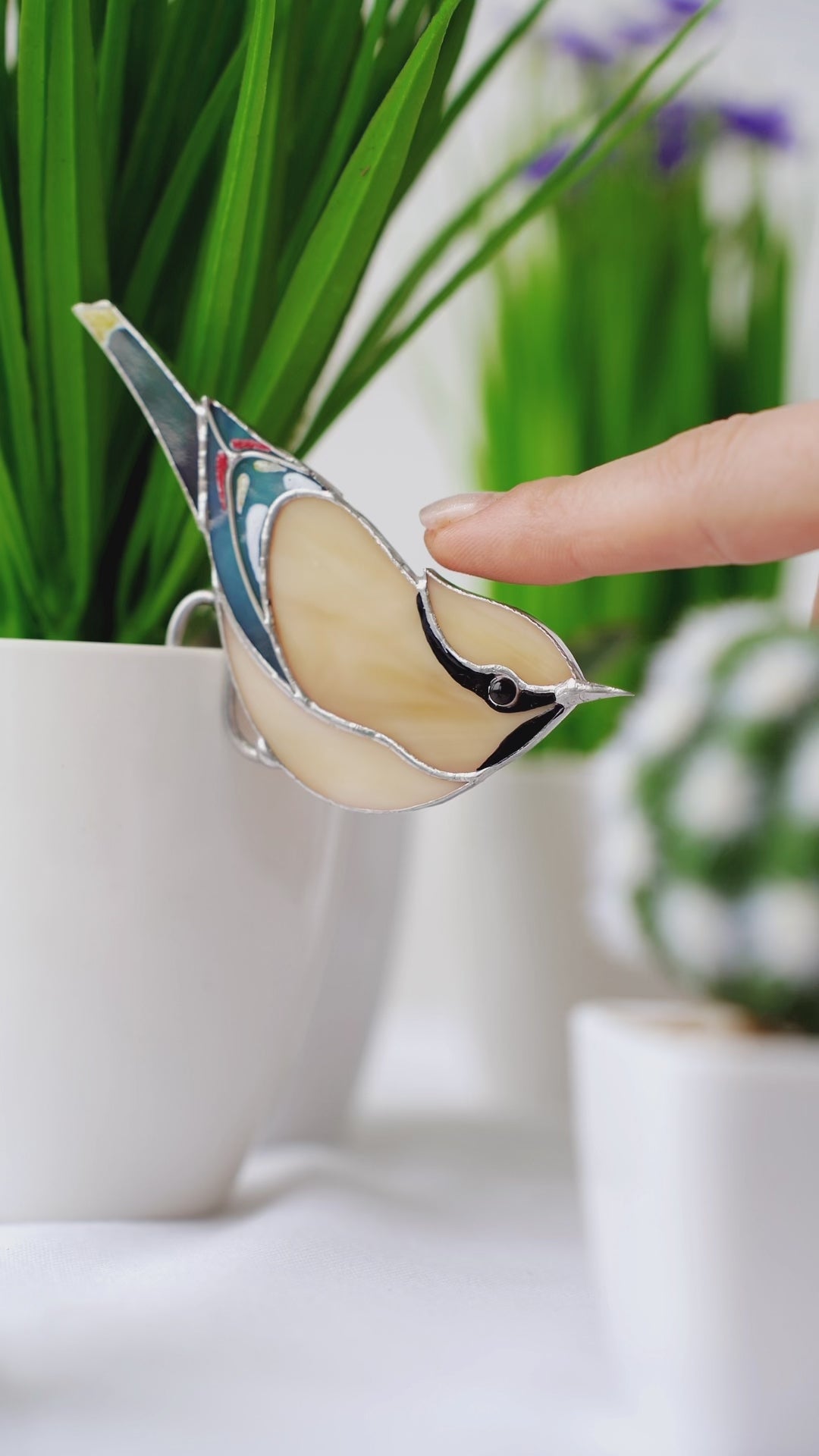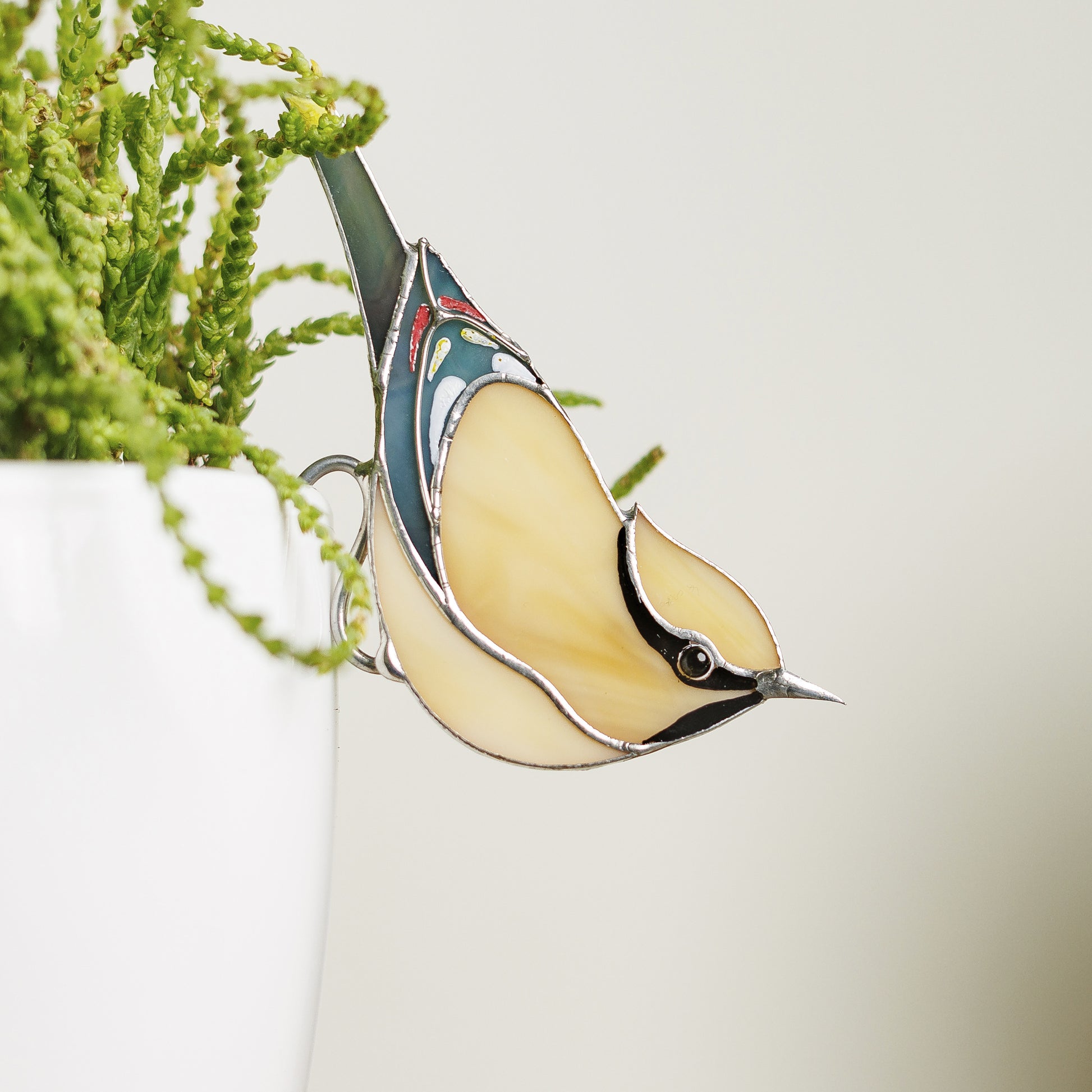 Stained glass Cedar Waxwing bird suncatcher flower pot decor - it’s a beautiful combination of artistry and nature charm that adds a touch of harmony to any room decor. The interaction of light and glass creates a breathtaking show, casting intricate patterns that dance and play, bringing joy and enchantment into your home or garden. Whether you display it in your living room, bedroom decor, country house decor or give it as a gift for bird lovers, this charming Cedar Waxwing bird suncatcher is guaranteed to delight conversation and love, becoming a treasured focal point that infuses your surroundings with warmth, playfulness, and timeless beauty. It’s a memorable gift for any occasion, like a birthday gift, anniversary gift, gift for wedding, Mother’s day gift or gift for your loved ones. Everyone who sees Cedar Waxwing bird suncatcher will remember you and the charming time you give it.