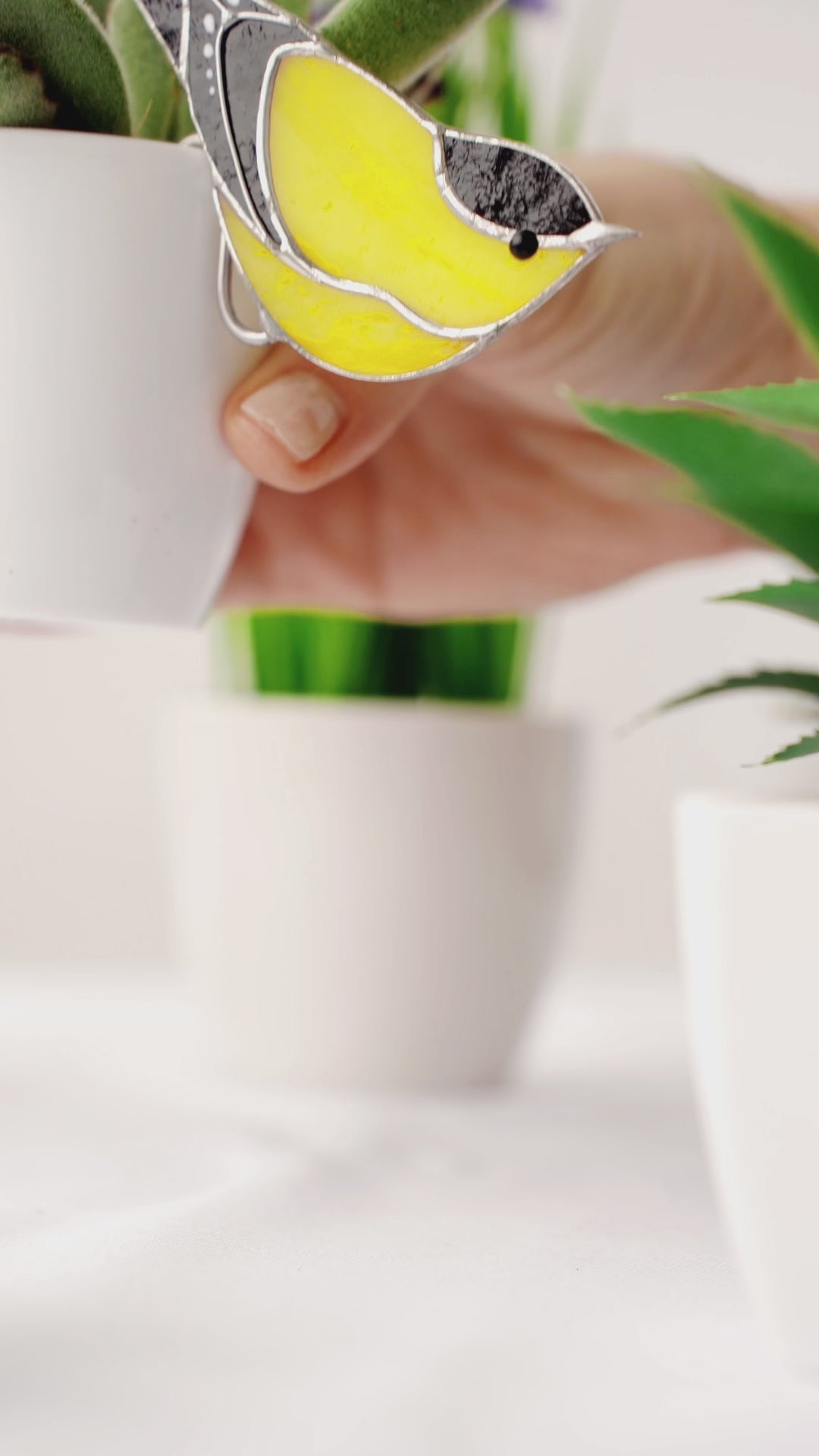 Stained glass bird Goldfinch suncatcher - a wonderful piece for flower-pots in your home decor. A combination of beauty and craftsmanship that will remain as beautiful as the first day of purchase, and will delight you every time you look at it. Stained glass Goldfinch bird suncatcher will give you peace and comfort in your home decor. It’s also considered as a symbol of freedom and a free spirit. Whether gracing your living room, bedroom, or any other space, this Goldfinch suncatcher invites admiration and tranquility. The delicate patterns and traits of the bird's body are accented, resulting in a stunning depiction of nature's beauty captured in time. It's a memorable gift for any occasion, like mother’s day gift, gift for loved ones, gift for family, birthday gift, gift for co-worker, etc.