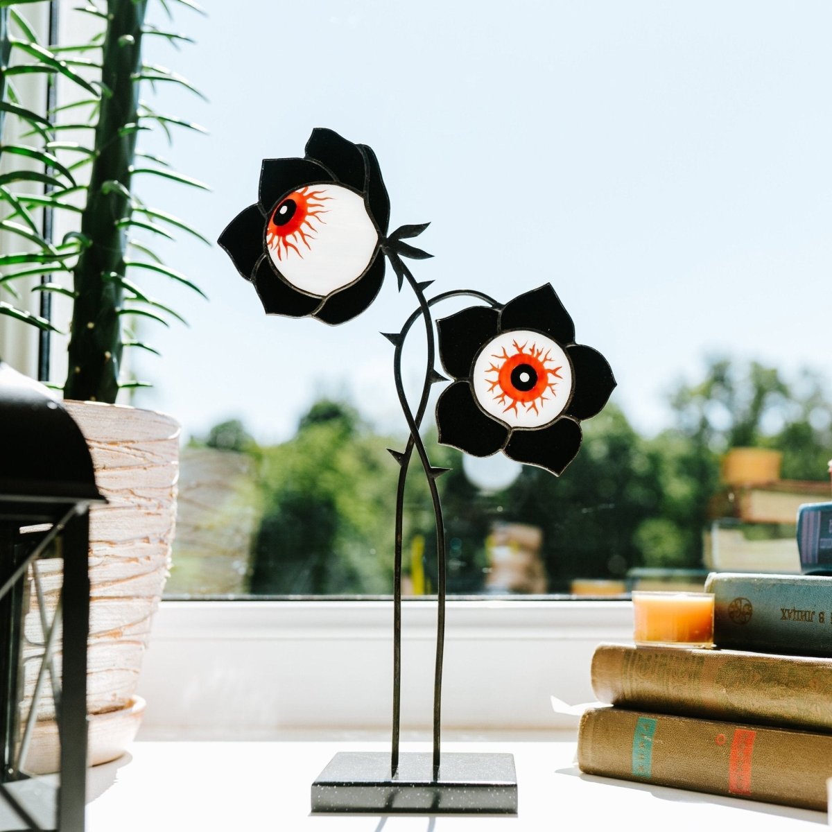 Don't settle for boring home decor. Let our stained glass suncatcher Creepy Eyeball Flower on stone stand elevate your space to new levels of uniqueness and intrigue.