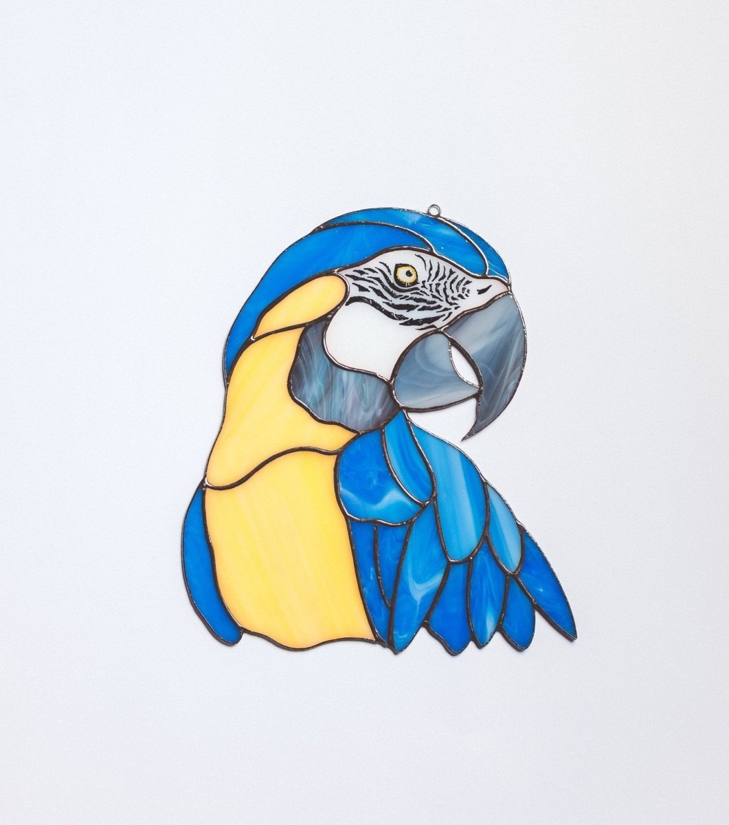 We've made this incredible collection of stained glass sun catchers especially for parrot lovers. Blue Macaw parrots have the strongest beak in the world. The Parrot Jaco, who knew 400 words, got into the Guinness Book of Records. The most ancient remains of the feathered cockatoo parrot date back to between the early and middle Miocene, that is, 24-16 million years ago.